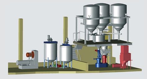 通過投料系統、上料系統、稱重系統、漿料輸送系統、過濾系統、除磁系統、預混系統、均質系統、研磨系統、儲存系統、罐裝系統等組成濕法研磨生產線。